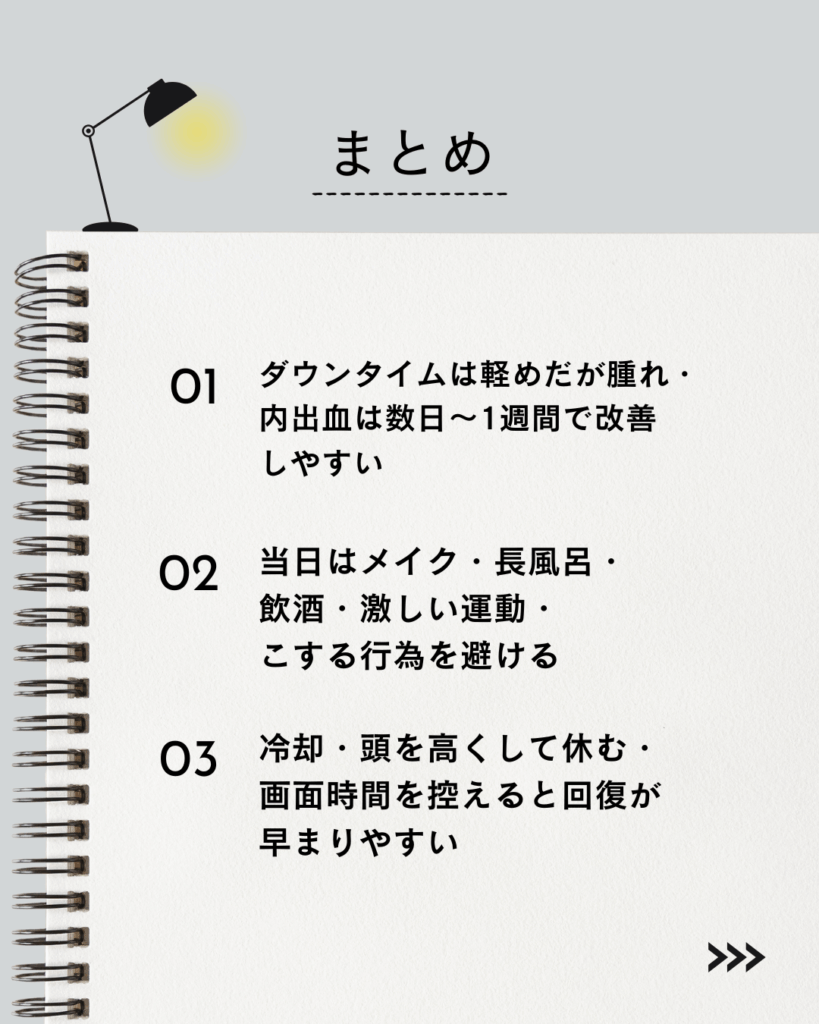 こうした行動を避けることで、腫れを早く引かせ、より快適なダウンタイムを過ごすことができます。