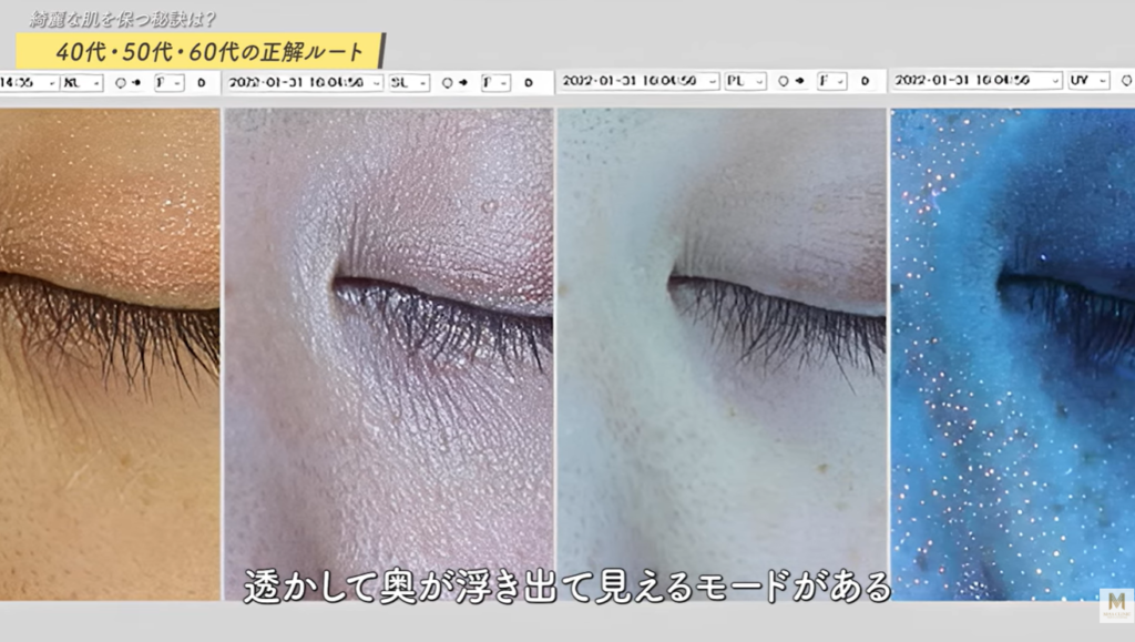 透けるように皮膚の内部を見せるモードでは、表面に出ていない“隠れジミ”が見えることもあります。