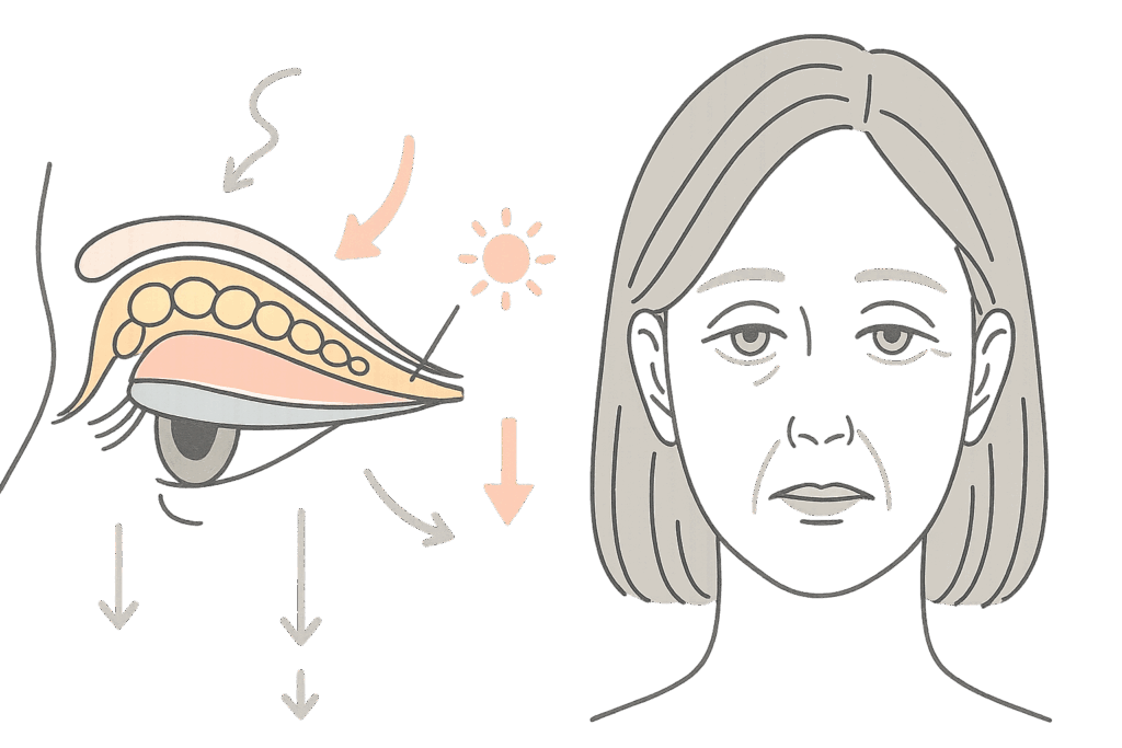 瞼を支える筋肉(眼瞼挙筋)が弱くなることで、皮膚が垂れ下がりやすくなります。