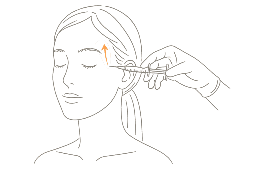 瞼そのものにヒアルロン酸を注入することで、瞼のハリを改善し、瞼のボリュームを支える力を上げるという考え方もできますが、たるんでいる瞼のボリュームが増えることで瞼自体の重さが増し、よりたるむ可能性もあります。基本的な方法論としては、リフトアップ目的でこめかみのあたりにヒアルロン酸を注入し、瞼を含めた顔全体のボリュームを引き上げる力を補強することで、瞼を開きやすくします。