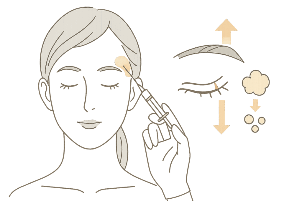瞼に打つことで、瞼の皮膚や瞼を引き上げる眼瞼挙筋が支えなくてはいけない重みが減るため、瞼のたるみ改善が期待できます。