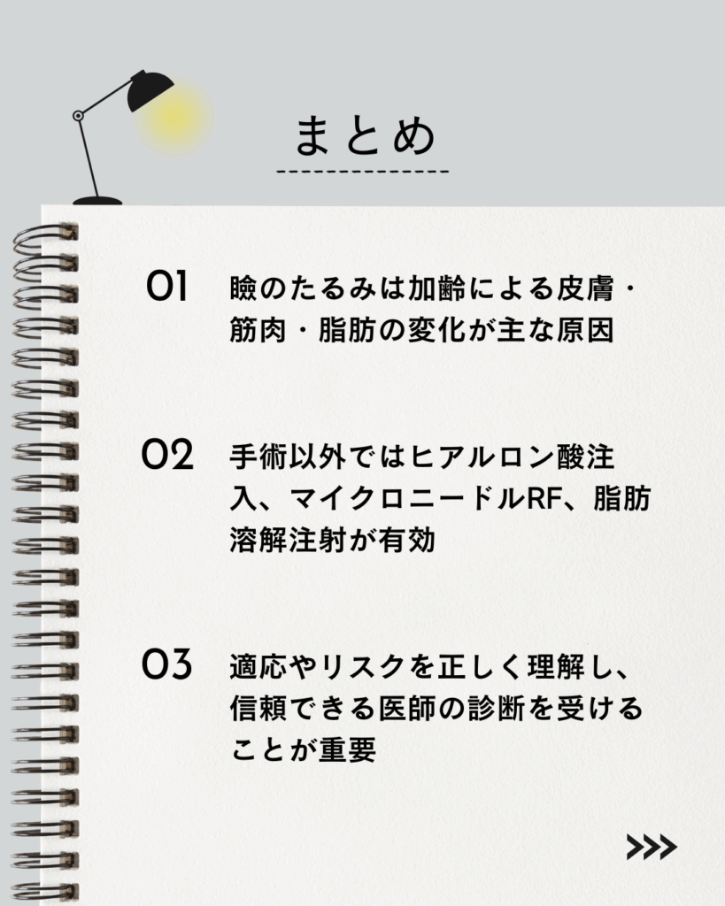 瞼のたるみを改善する方法として、外科手術に頼らずに効果を得られる「ヒアルロン酸注入」と「マイクロニードルRF治療」は非常に有効です。それぞれの施術には独自のメリットがあり、個々のニーズやライフスタイルに合わせて選ぶことができます。