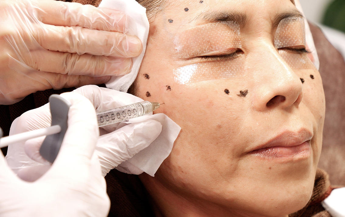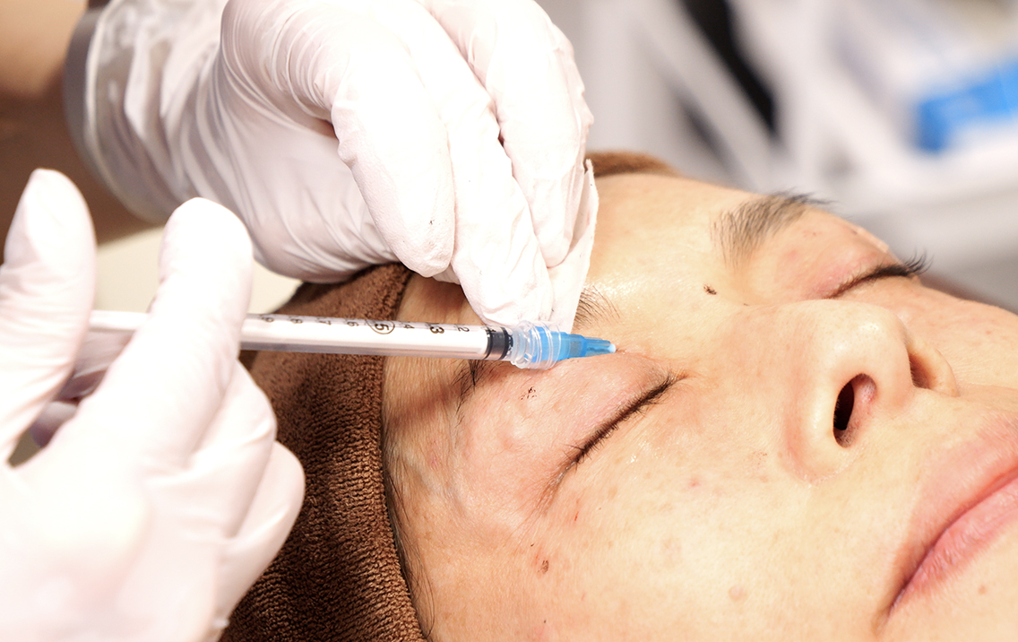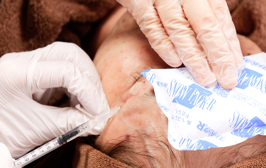 筋肉を動かす神経伝達物質の放出を抑える製剤です。注入した箇所の筋肉の動きを和らげることで、表情ジワが出やすい部分をケアします。今回は目尻と眉間に注入し、これらの部位の表情ジワが過剰に出すぎないようにしました。
