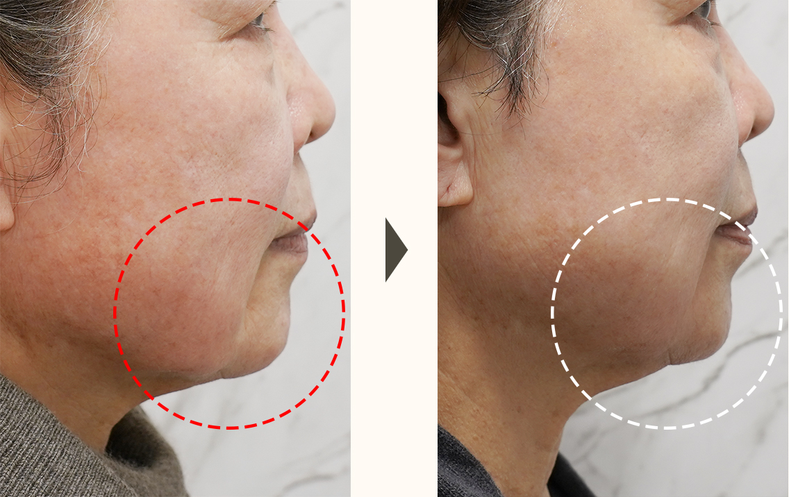特に40歳以上になると、肌のハリが失われ、頬や顎まわりのたるみが目立つようになります。今回施術を受けていただいた女性のように、70代ともなると、皮膚組織は相当菲薄化しています。たるみ方はタイプによって様々ですが、たるみが顕著に表れるようになります。