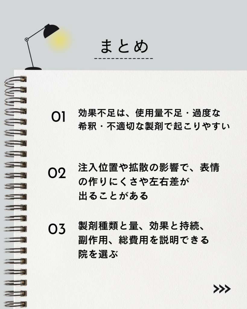 ボトックス注射は、神経伝達物質「アセチルコリン」の放出を抑制することで、表情ジワの改善を始めとする様々な効果を出します。ボトックスの量が少なければ「アセチルコリン」の抑制も限定的になり、期待した効果が出なくなります。