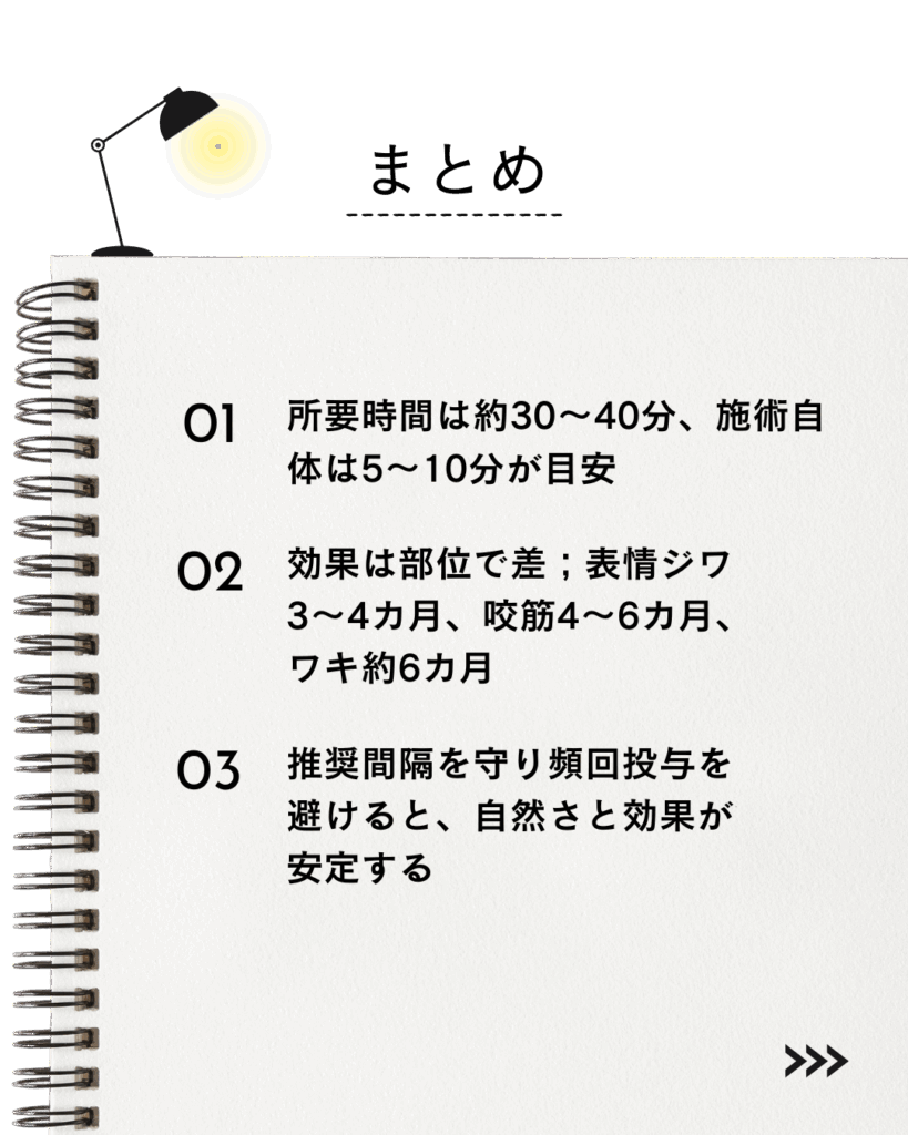 ここでは、ボトックス注射の施術にかかる具体的な時間と、施術後に気をつけるべきポイントを見ていきましょう。