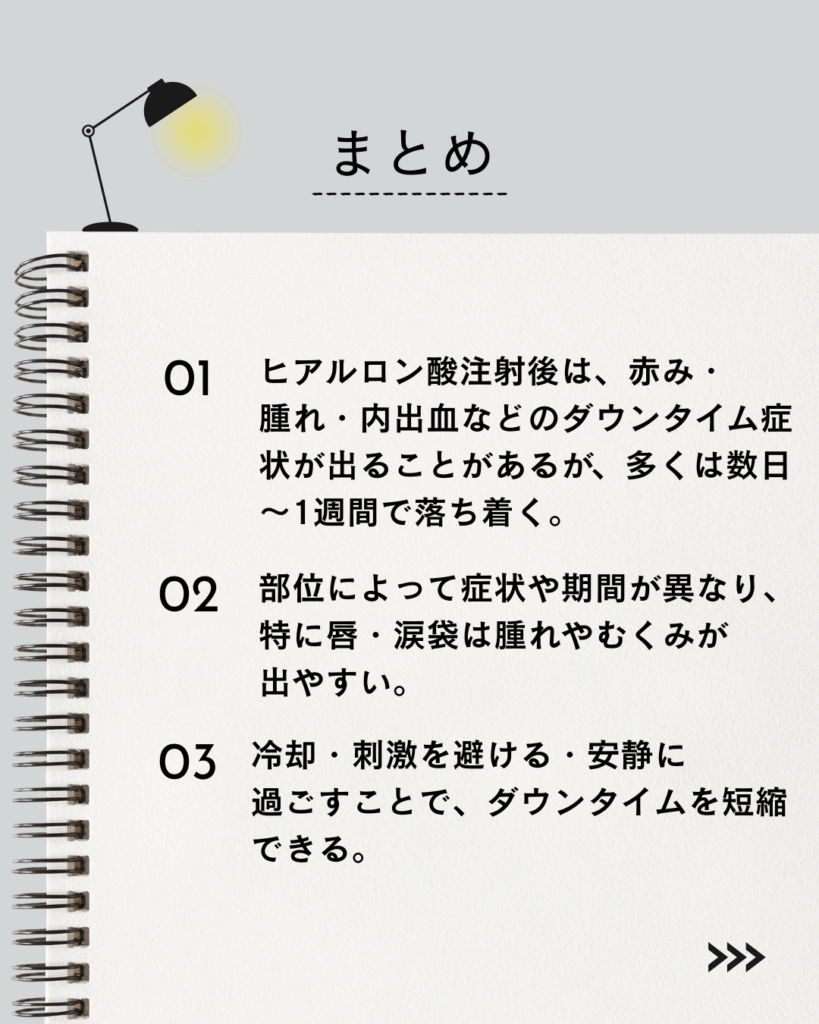 本記事では、ヒアルロン酸注射のダウンタイムについて、部位ごとの症状や回復期間の目安を詳しく解説します。