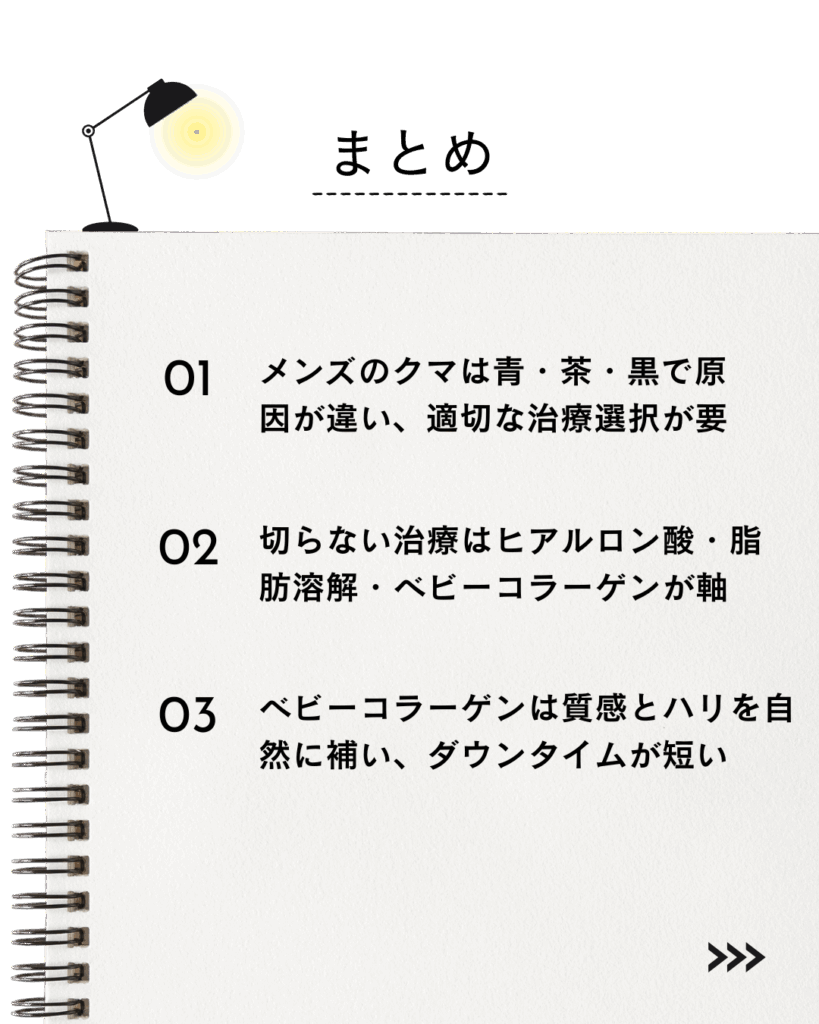 本記事では、男性のクマの特徴から最新の施術法「ベビーコラーゲン」まで、詳しくご紹介します。