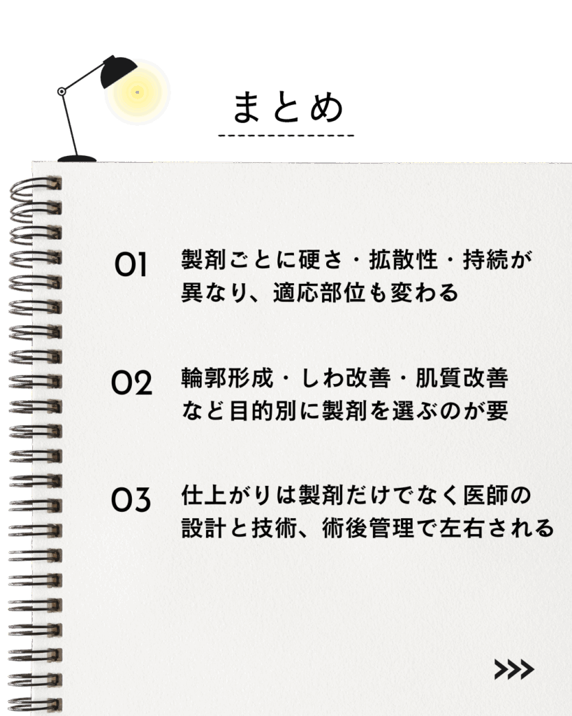 たとえば、柔らかい製剤は皮膚が薄い部分(涙袋や唇など)に、硬めの製剤は深いしわや骨格補正(あご・フェイスラインなど)に用いられることが一般的です。