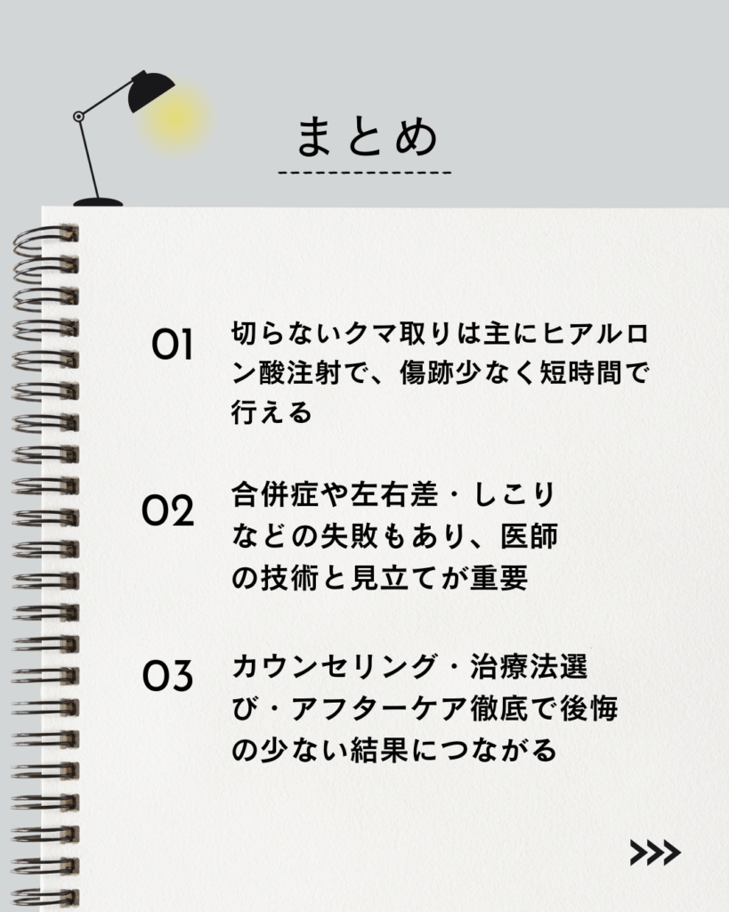 満足度の高い結果を得るためには、まず「自分のクマの原因」を正確に知ること、そして「信頼できるクリニックや医師」を選ぶことが最も重要です。