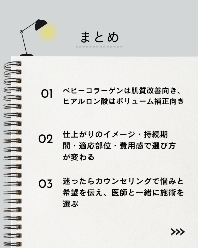 「短期集中で変化を出したい」ならヒアルロン酸、「じっくり肌質を改善したい」ならベビーコラーゲンが向いているといえます。