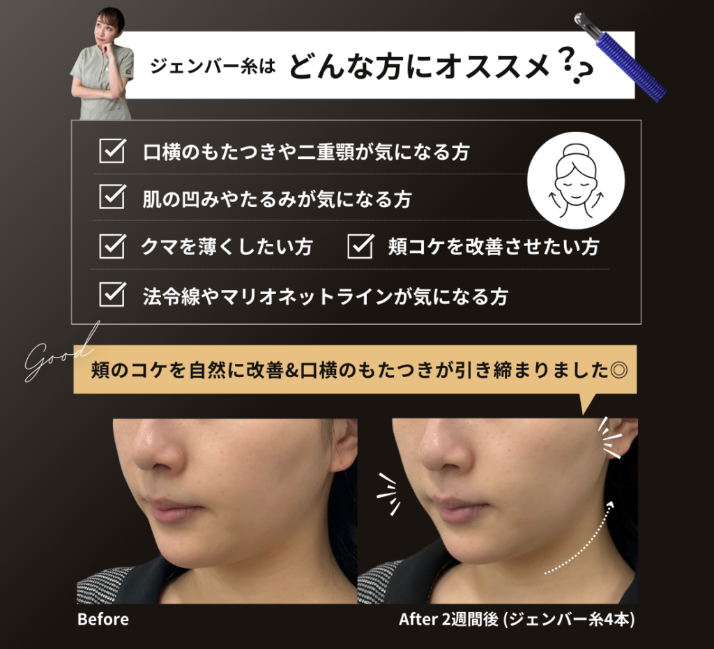 ほうれい線、マリオネット、クマ、頬コケ、二重顎など様々なお悩みを改善する万能な糸です✨
