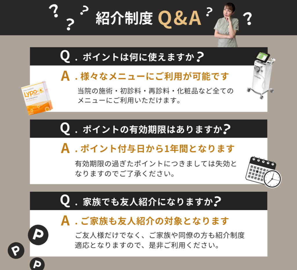 ポイント有効期限:付与日より1年間(ご友人様のご来院時にポイントを付与いたします。)