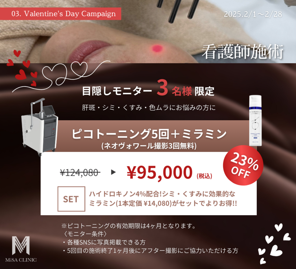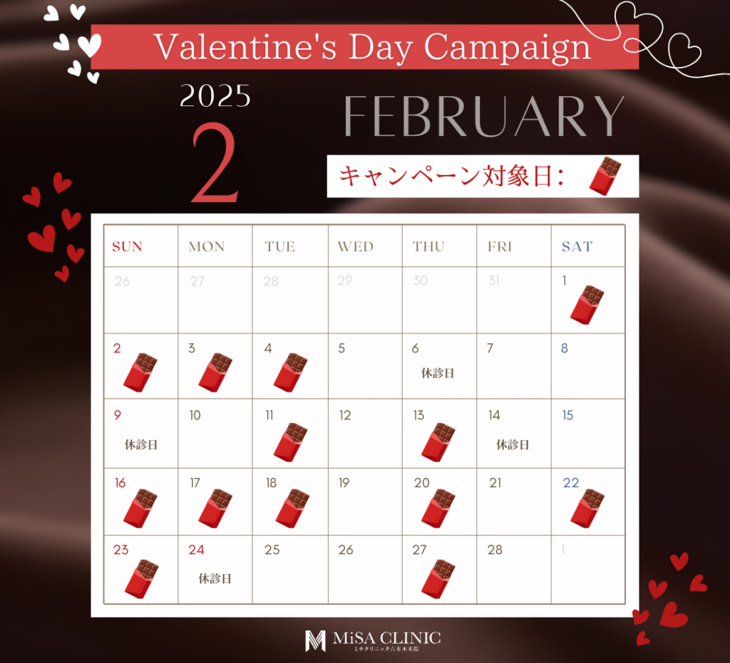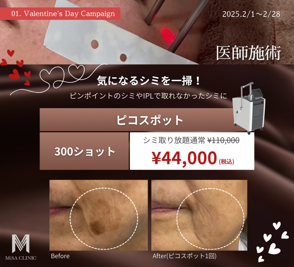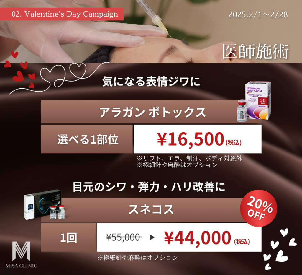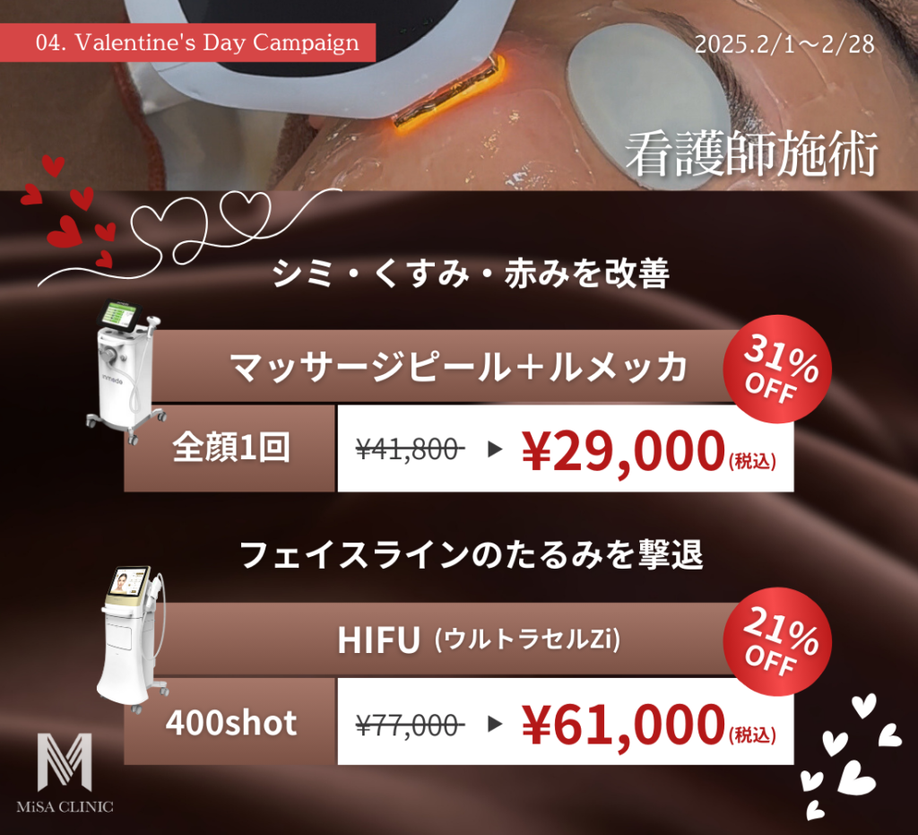 2月キャンペーンのお知らせ 2025 1/22 キャンペーン情報 2025年1月22日 目次2月キャンペーンのお知らせです🍫 キャンペーン枠には限りがございますので、気になる方はお早めにご予約ください。皆様のご来院をスタッフ一同心よりお待ちしております。 ◼︎ご予約方法◼︎ キャンペーン情報 この記事が気に入ったら いいね または フォローしてね! Follow @MiSA_Clinic Follow Me よかったらシェアしてね! URLをコピーしました! 国内最大規模の経済ニュースプラットフォーム NEWS PICKS|OFFRECO.に寺井院長が出演しました。 動画「40代からのたるみ改善!広頸筋ボトックスで首&顔をスッキリ」を公開しました。 関連記事 New Year Campaignのお知らせ 2025年12月21日 12月キャンペーンのお知らせ 2025年11月21日 肌育注射導入キャンペーンのお知らせ 2025年11月2日 11月キャンペーンのお知らせ 2025年10月20日 3周年記念 高濃度プレミアムエクソソームキャンペーンのお知らせ 2025年10月14日 新ドクター入職&キャンペーンのお知らせ 2025年10月4日 サブシジョン導入キャンペーンのお知らせ 2025年9月26日 10月キャンペーンのお知らせ 2025年9月20日