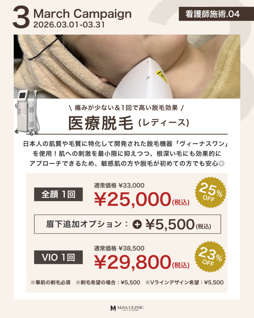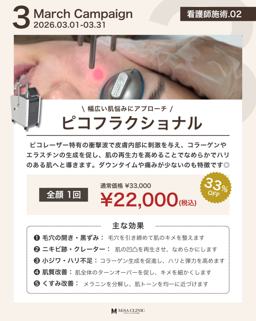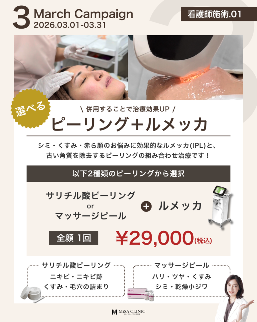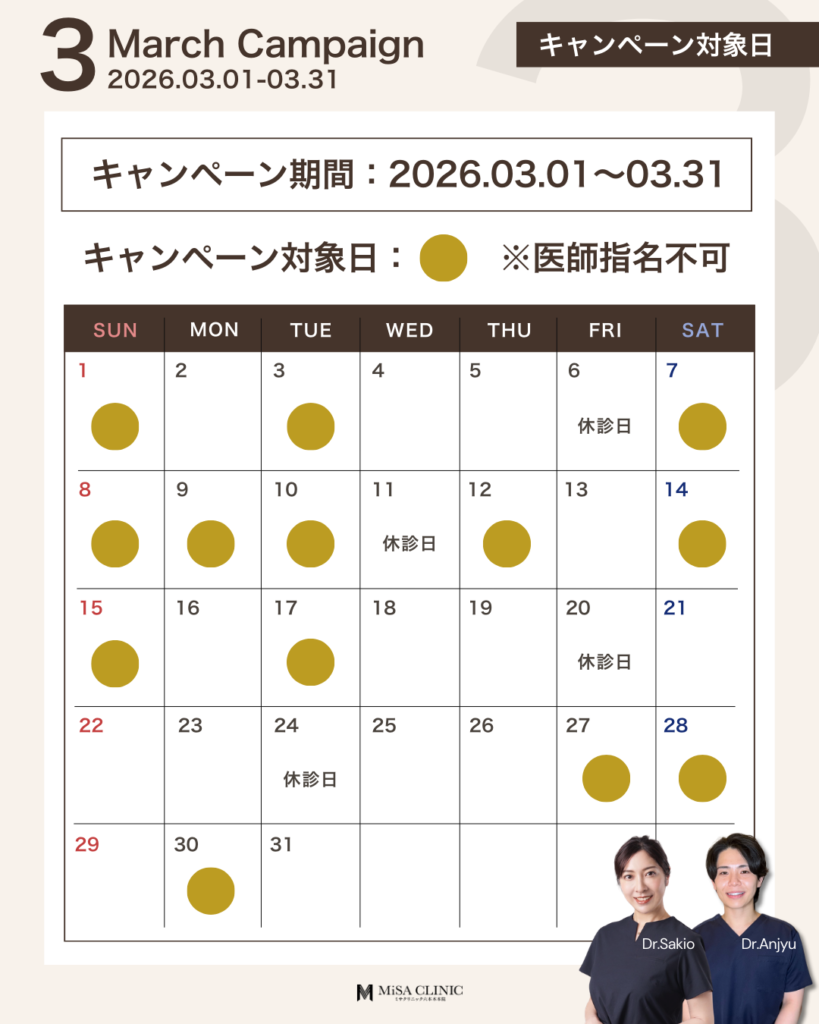 3月キャンペーンのお知らせ 2026 2/27 キャンペーン情報 2026年2月27日 3月キャンペーンのお知らせです🎎 キャンペーン枠には限りがございますので、気になる方はお早めにご予約ください。皆様のご来院をスタッフ一同心よりお待ちしております。 WEB予約24時間受付中 LINE予約24時間受付中 03-6910-5774営業時間:10:00-19:00 キャンペーン情報 この記事が気に入ったら いいね または フォローしてね! Follow @MiSA_Clinic Follow Me よかったらシェアしてね! URLをコピーしました! 動画「【40代からの美容投資】デパコスより美容医療の方がコスパが良い?賢いお金の使い分けを医師が解説」を公開しました。 動画「(最新たるみ治療】 HIFUやサーマクールでもう満足できない方へ。ATTIVAの効果と持続期間を徹底解説」を公開しました。 関連記事 2月キャンペーンのお知らせ 2026年1月24日 次世代切らないたるみ治療【ATTIVA】導入&キャンペーンのお知らせ 2026年1月22日 日曜日担当・安重医師限定プランのお知らせ 2026年1月14日 土曜日担当・崎尾医師限定プランのお知らせ 2026年1月13日 New Year Campaignのお知らせ 2025年12月21日 12月キャンペーンのお知らせ 2025年11月21日 肌育注射導入キャンペーンのお知らせ 2025年11月2日 11月キャンペーンのお知らせ 2025年10月20日