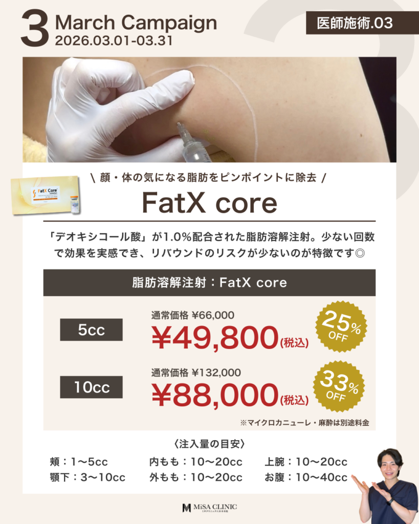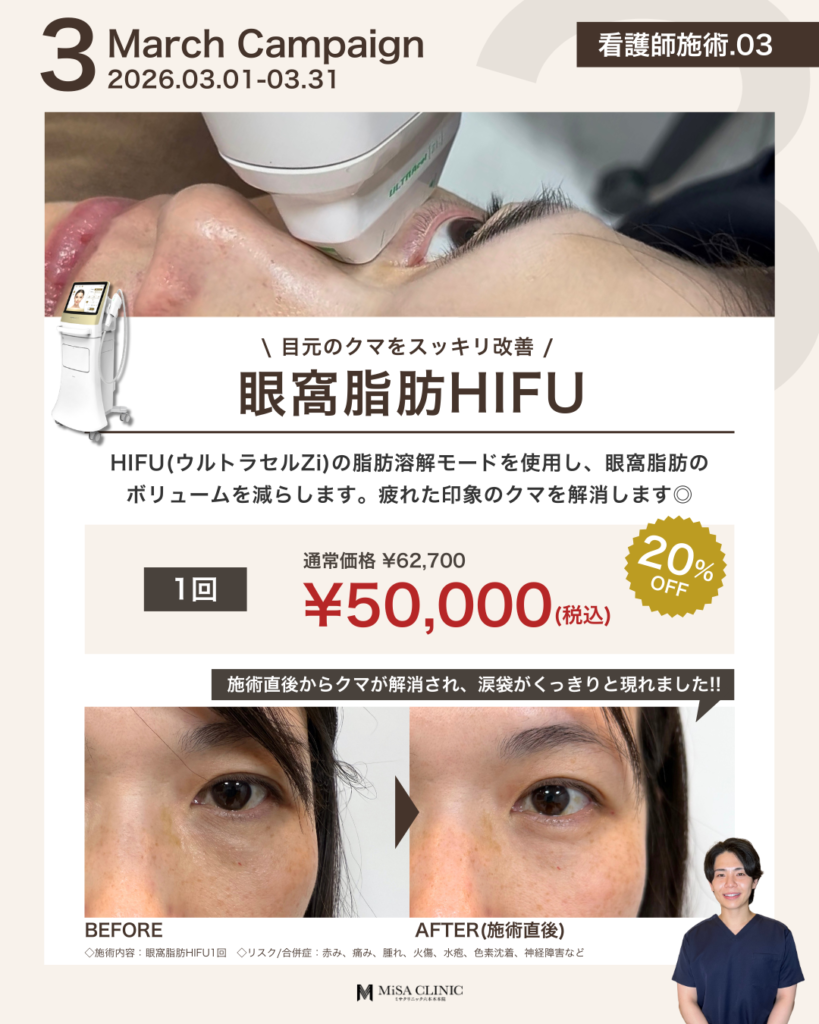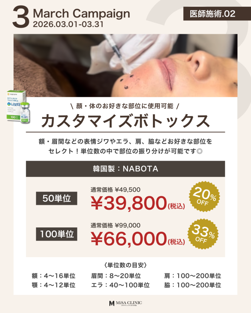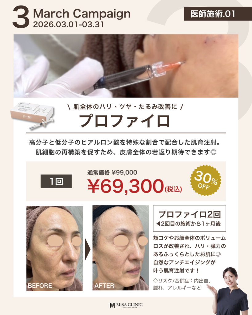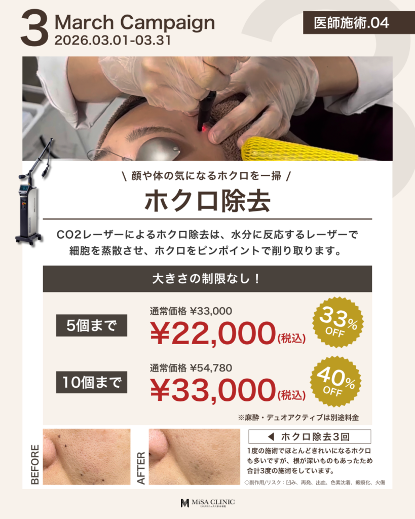 3月キャンペーンのお知らせ 2026 2/27 キャンペーン情報 2026年2月27日 3月キャンペーンのお知らせです🎎 キャンペーン枠には限りがございますので、気になる方はお早めにご予約ください。皆様のご来院をスタッフ一同心よりお待ちしております。 WEB予約24時間受付中 LINE予約24時間受付中 03-6910-5774営業時間:10:00-19:00 キャンペーン情報 この記事が気に入ったら いいね または フォローしてね! Follow @MiSA_Clinic Follow Me よかったらシェアしてね! URLをコピーしました! 動画「【40代からの美容投資】デパコスより美容医療の方がコスパが良い?賢いお金の使い分けを医師が解説」を公開しました。 動画「(最新たるみ治療】 HIFUやサーマクールでもう満足できない方へ。ATTIVAの効果と持続期間を徹底解説」を公開しました。 関連記事 2月キャンペーンのお知らせ 2026年1月24日 次世代切らないたるみ治療【ATTIVA】導入&キャンペーンのお知らせ 2026年1月22日 日曜日担当・安重医師限定プランのお知らせ 2026年1月14日 土曜日担当・崎尾医師限定プランのお知らせ 2026年1月13日 New Year Campaignのお知らせ 2025年12月21日 12月キャンペーンのお知らせ 2025年11月21日 肌育注射導入キャンペーンのお知らせ 2025年11月2日 11月キャンペーンのお知らせ 2025年10月20日