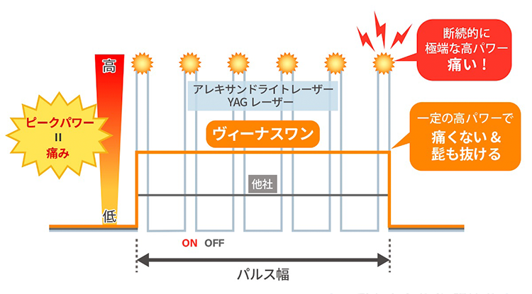 ヴィーナスワンは、日本人の肌質や毛質に特化して開発された脱毛機器です。日本人の毛質に最適な808nm波長のレーザーを一定の高出力で照射します。