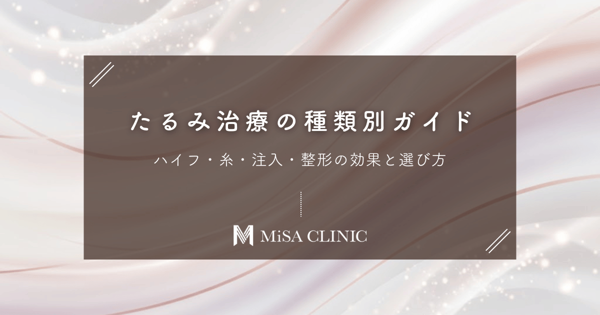 美容皮膚科のたるみ治療について解説。効果的なレーザー、HIFU、注入、糸リフト(スレッドリフト)を比較し、それぞれの特徴、ダウンタイム、料金目安を紹介しています。たるみの原因やセルフケアの限界、失敗しないクリニック選びのポイントも詳しく説明しました。 -